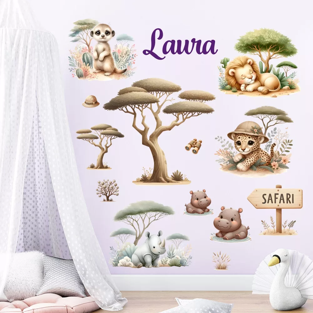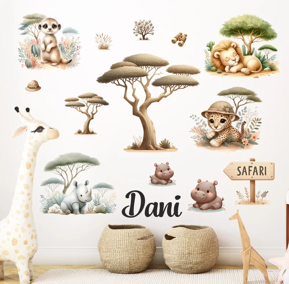 Falmatrica-falidekoráció babaneves-gyerekneves dekorbetű kiegészítővel a falra. Hozd el a vadon izgalmát a gyerekszobába ezzel a lenyűgöző Szafari kaland falmatricával! Az aranyos, akvarell stílusú oroszlán, tigris, orrszarvú és víziló vidám hangulatot varázsol a falakra, mintha egy igazi szafari közepébe csöppennénk. A kompozíció különlegessége, hogy gyermeked neve is rákerül, így a szoba egyedi és személyes dekorációvá válik.A dekornév névre szóló ajándéknak is kítűnő választás.